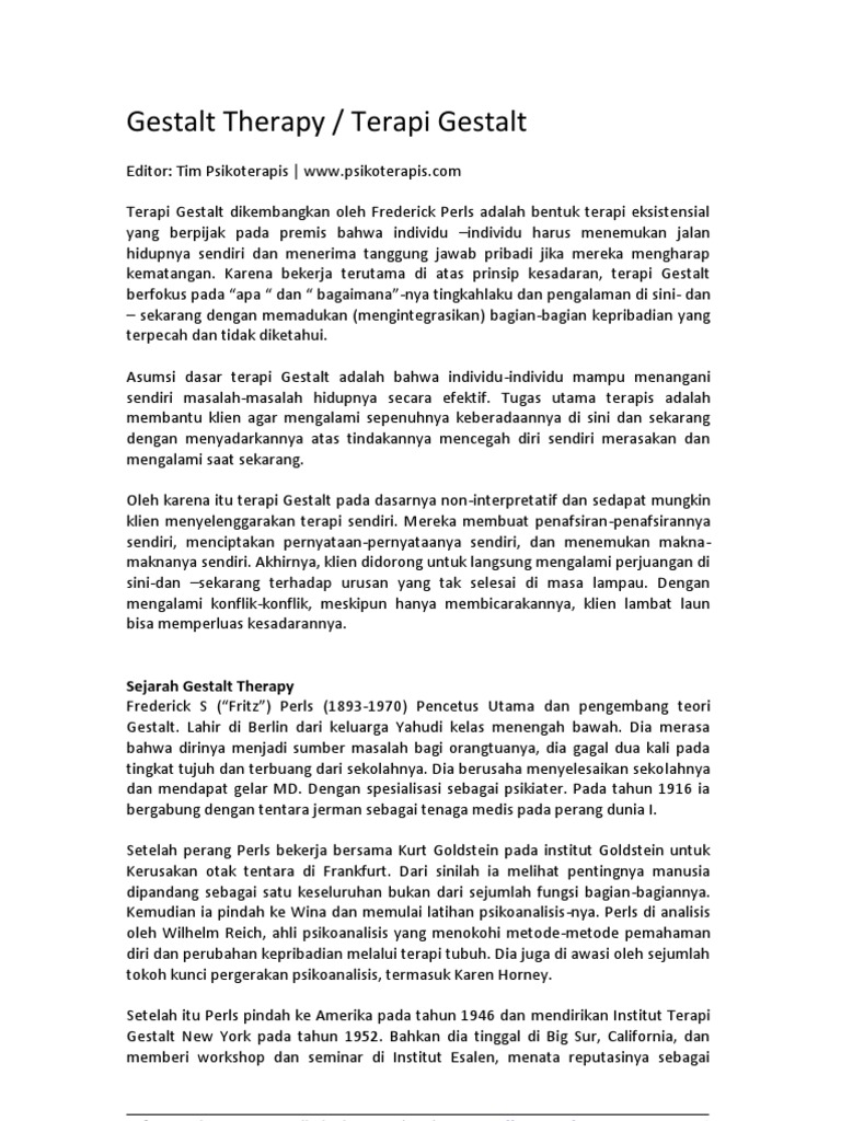 Pk6303 terapi gestalt 2 isi kandungan. Teori gestalt beroposisi terhadap teori strukturalisme. Peran dan fungsi konseling teori gestaltpelaku terapi gestalt membantu klien untuk mengembangkan kesadarannya dan mengalami bagaimana mereka berada dalam suatu keadaan saat ini. Sangat diperlukan untuk membantu organisasi mengurangkan bilangan. Asesmen dalam bimbingan dan konseling (modul profesional). Tokoh pendekatan konseling gestalt fritz perls 3. Avoid analysis… psikologi kaunseling teori dan pendekatan pengalaman dalam kaunseling person centred theory,gestalt theory 40. Rizki wira paramita,universitas konseling gestalt. Teori ini dibangun oleh tiga orang, kurt koffka, max wertheimer, and. Teori gestalt therapy yaitu teori pendekatan yang berlawanan dengan teori psikoanalisa dan teori ini berasal dari pengembangan empat disiplin ilmu yaitu psikoanalis, fenomenologis. Gestalt, behavior al dan rasional emotif therapy. Nama pendekatan konseling gestalt gestalt 2. 2 pokok pandangan gestalt adalah bahwa obyek atau peristiwa tertentu akan dipandang sebagai sesuatu keseluruhan yang.