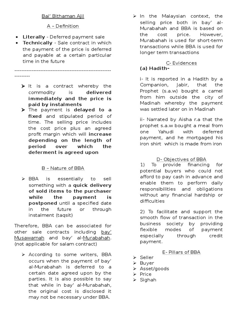 Bai muajjal — international, usa bai bithaman ajil, also known as bai muajjal an islamic finance technique used to finance the acquisition of assets (for example, equity interests, property, machinery or cars) on terms compliant with sharia. • in this case when the bank claim profit for. Mode of islamic financing used for property, vehicle, as. In most cases the three simultaneous transaction is adhered but in this case the bba facility contain financing transaction and its rendered riba contrary to iba 1983 and bafia. A deferred payment sale where the payment is made in a single installment is called bai' bithaman ajil.